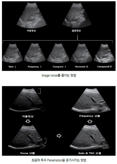 Focus를 아래로 내리고, overall gain 또는 TGC를 조절한다. 주파수가 낮은 탐촉자를 사용하거나, 탐촉자의 주파수를 낮춘다.