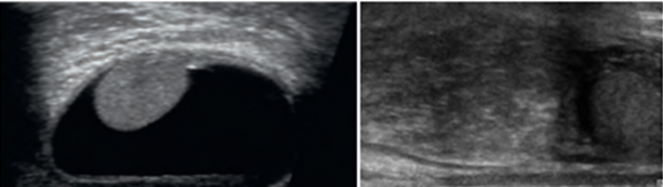 고환 초음파 – 좌측 음낭수종의 경우 까만 물이 고환 주변에 있으며 우측 탈장의 경우 고환 위에 장 부속기관(장간만)이 내려온 것을 관찰할 수 있다.