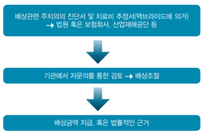 각 기관에는 자문의사를 두고 현재 운영 중에 있으며 산업재해보상보험법 시행령의 제42조와 제 43조에 의거하여 자문의사의 가격으로 대학(임상) 교수나 대학부속병원, 국립의료기관 중 5년이상의 근무경력을 지닌 의사를 대상으로 3년을 기간으로 하여 연임이 가능하게 되어 있다. 2015년 11월 현재 근로복지공단의 자문의사수는 1,662명이고 비뇨기과 자문의사는 79명이 위촉되어 있다. 이러한 배상과 관련된 흐름은 맥브라이드에 의거하여 배상관련 주치의의 진단서 및 치료비 추정서를 작성하여 법원 혹은 보험회사. 산업재해공단 등에 제출을 하게 되며 각 기관의 자문의를 통해 검토를 하여 배상의 정도를 조절하고 배상금액을 지급하거나 법률적인 근거를 마련하게 된다 (그림 1).