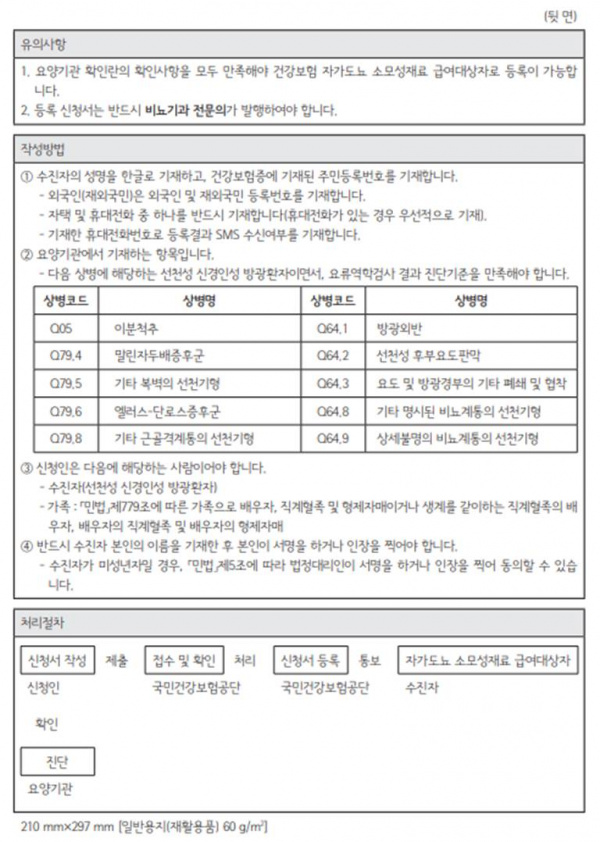 | 자가도뇨 소모성재료 | 1. 다음 각 목 모두에 해당하는 것으로 진단된 선천성 신경인성 방광환자로서 별지 제4호서식에 따라 공단에 신청하여 등록된 사람